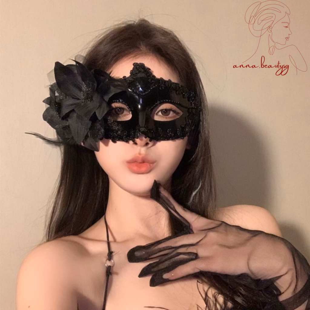 - Thiết kế: Nửa mặt nạ công chúa với lông vũ và hoa