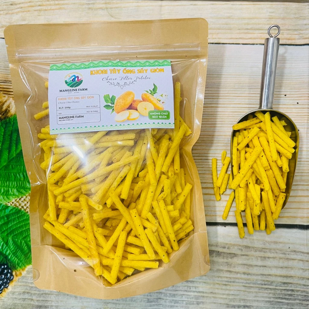 - Khoai tây phô mai dạng ống Mangline Farm Đà Lạt 250g: Sản phẩm này được sản xuất từ khoai tây tươi ngon tại Đà Lạt, với quy trình sản xuất nghiêm ngặt để đảm bảo độ giòn tan và hương vị thơm ngon.