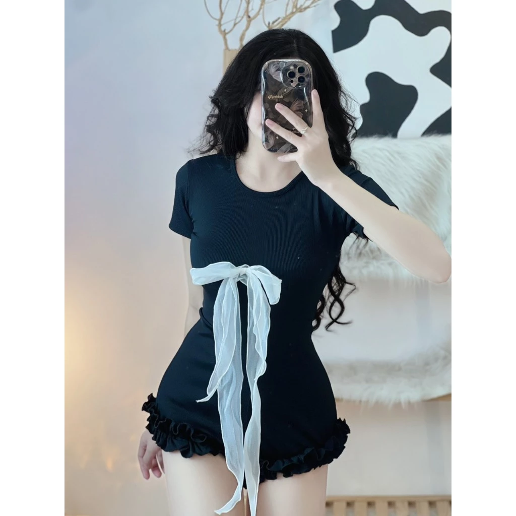 🔥 Jumpsuit nữ mặc đi biển du lịch đồ bơi jumpsuit cổ tròn tay ngắn nơ to viền bèo đùi ngắn có video đang giảm giá!
